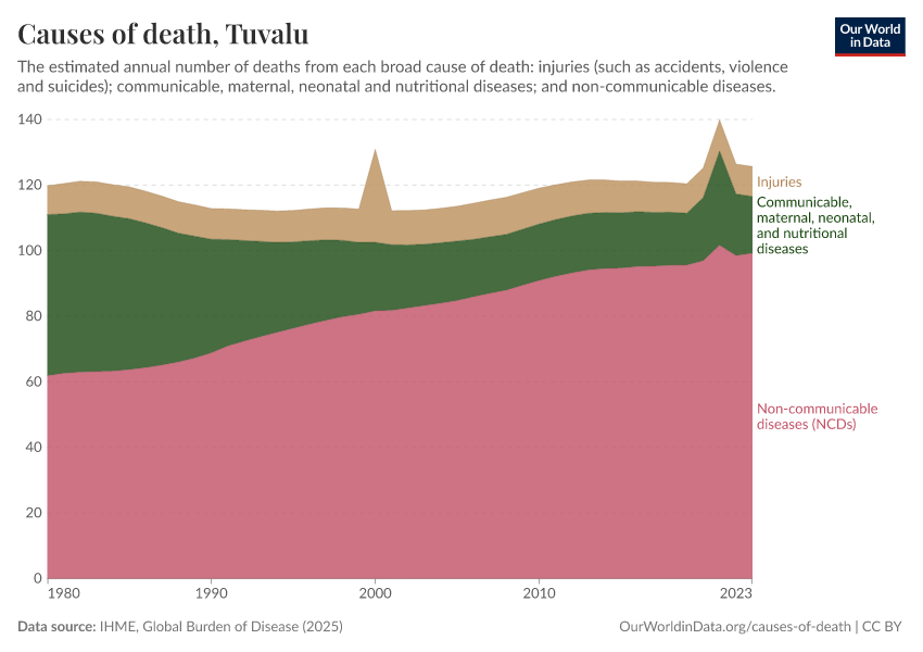 In the chart, you can see the breakdown of deaths in Tuvalu by these broad categories. In 2023, 17.3 died from communicable diseases, 99.2 from NCDs, and 9.15 from injuries.