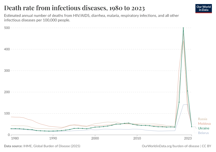 In the chart, you can see how death rates from communicable diseases in Ukraine have changed over time. This is shown alongside neighboring countries for comparison.