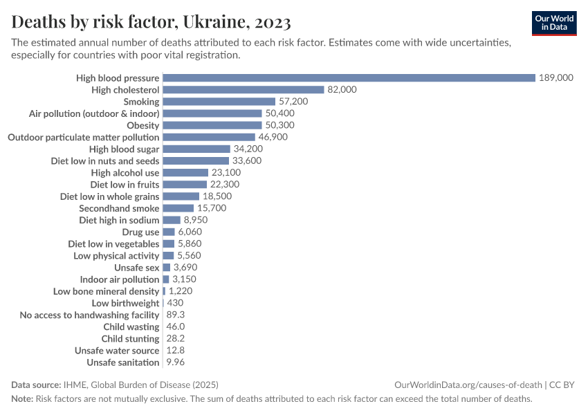 In the chart, you can see modeled estimates for how many people in Ukraine die prematurely as a result of various risk factors. Note that the same death can be attributed to multiple risk factors, so the death tolls from different risk factors cannot simply be added up (this is why their sum can be higher than the total number of deaths).