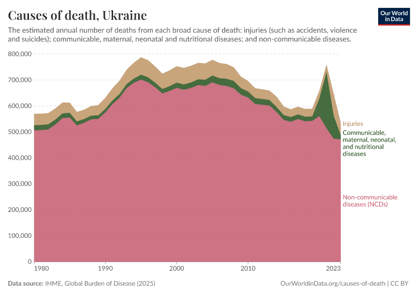 In the chart, you can see the breakdown of deaths in Ukraine by these broad categories. In 2023, 15,600 died from communicable diseases, 472,000 from NCDs, and 46,500 from injuries.