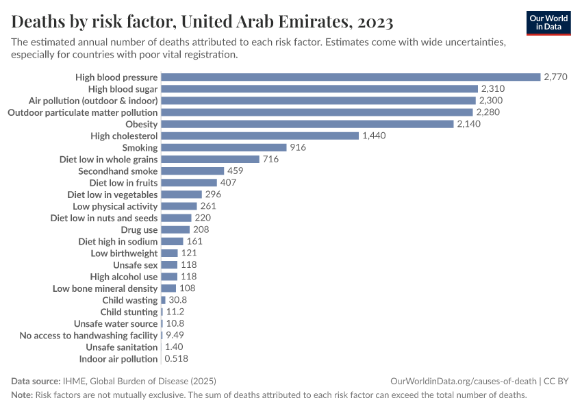 In the chart, you can see modeled estimates for how many people in the United Arab Emirates die prematurely as a result of various risk factors. Note that the same death can be attributed to multiple risk factors, so the death tolls from different risk factors cannot simply be added up (this is why their sum can be higher than the total number of deaths).