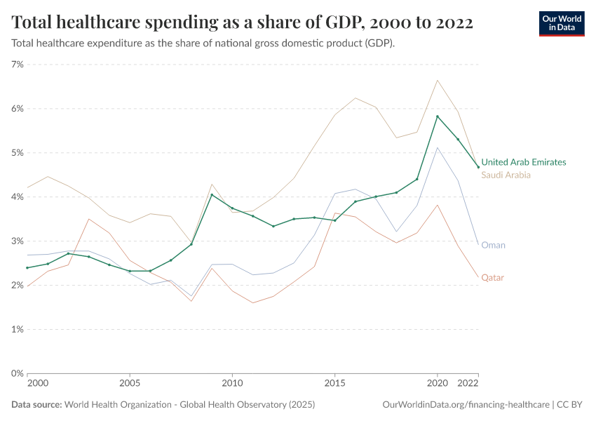 In 2022, the United Arab Emirates’ healthcare spending was equivalent to 4.7% of its national gross domestic product (GDP).