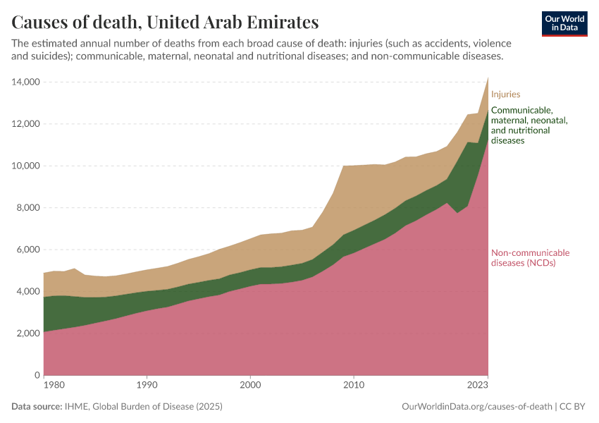 In the chart, you can see the breakdown of deaths in the United Arab Emirates by these broad categories. In 2023, 1,400 died from communicable diseases, 11,300 from NCDs, and 1,570 from injuries.