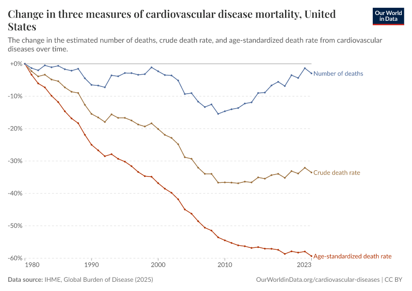 There are several metrics we can use to understand mortality: the total number of deaths, the crude death rate (which simply divides the number of deaths by the country’s population), or the age-standardized death rate, which holds the age structure of the population constant, removing the effect of population aging from the trend.