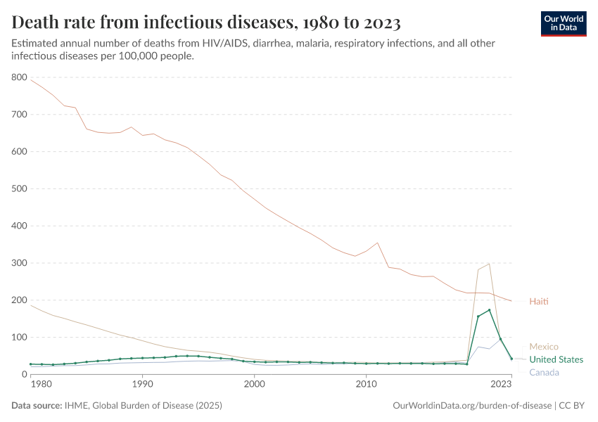 In the chart, you can see how death rates from communicable diseases in the United States have changed over time. This is shown alongside neighboring countries for comparison.