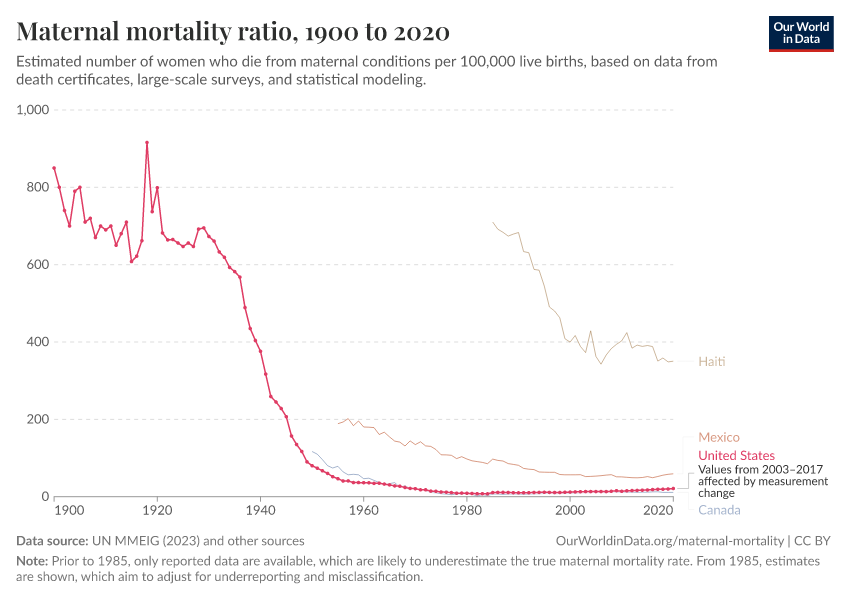 In the chart, you can see the United States’ maternal mortality rates over time, alongside neighboring countries for comparison. This is measured as the number of deaths per 100,000 live births.