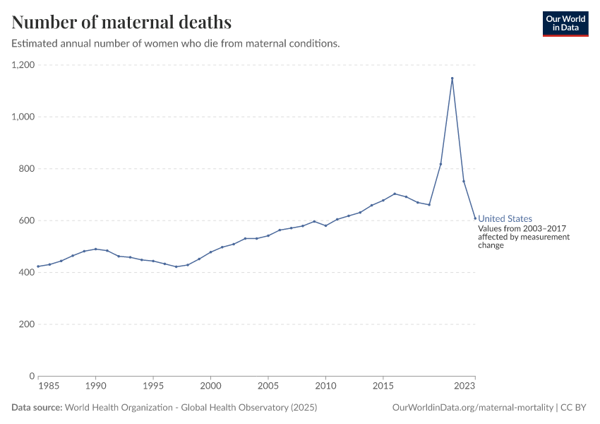 In the chart, you can see the number of women in the United States who died during pregnancy or in childbirth each year. In 2023, this was 608 women.