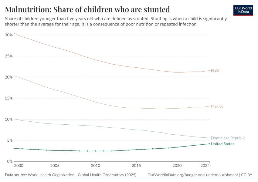 In the chart, you can see what share of children in the United States are stunted, alongside neighboring countries. In 2024, this share was 4.2%.