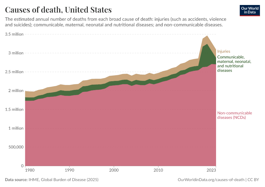 In the chart, you can see the breakdown of deaths in the United States by these broad categories. In 2023, 172,000 died from communicable diseases, 2.70 million from NCDs, and 217,000 from injuries.