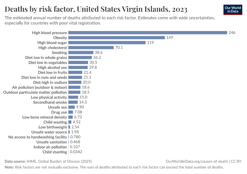 In the chart, you can see modeled estimates for how many people in the United States Virgin Islands die prematurely as a result of various risk factors. Note that the same death can be attributed to multiple risk factors, so the death tolls from different risk factors cannot simply be added up (this is why their sum can be higher than the total number of deaths).