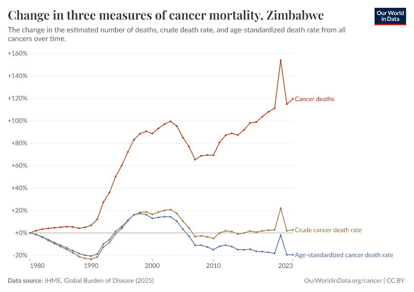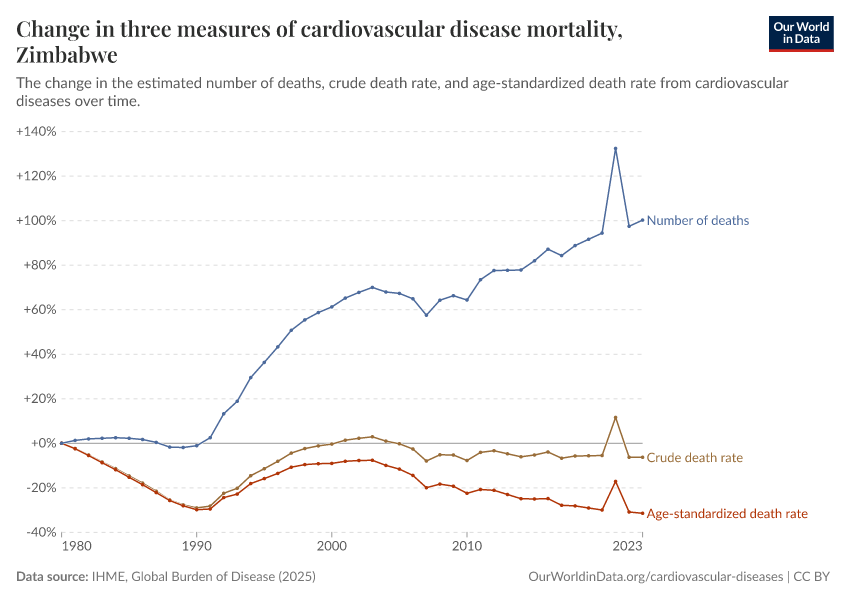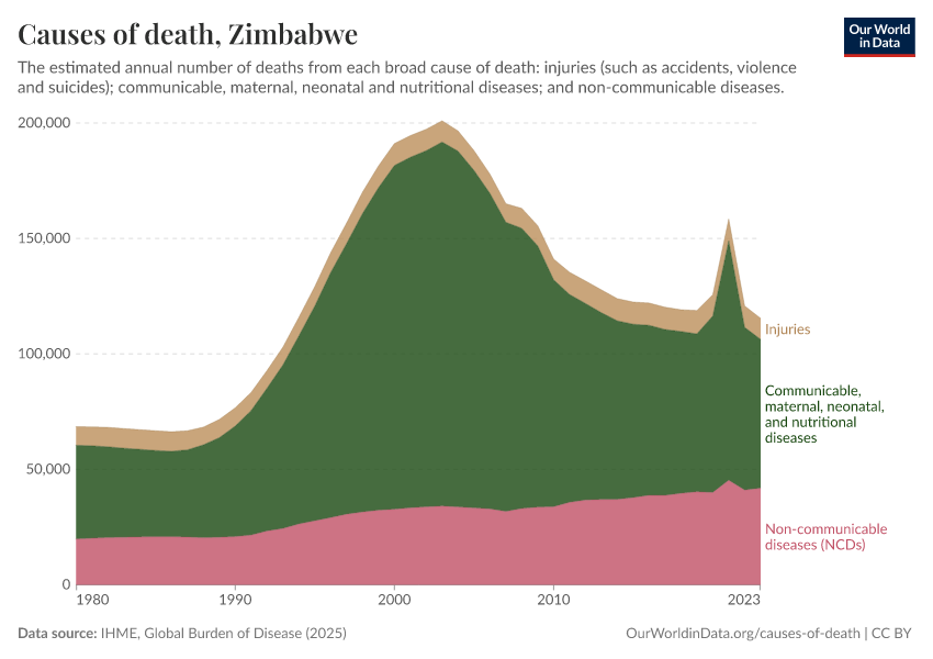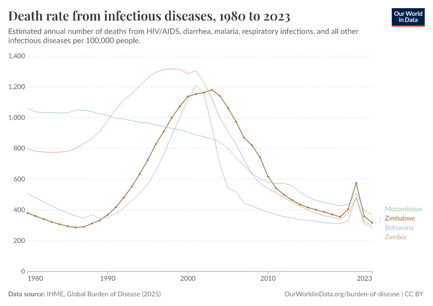 In the chart, you can see how death rates from communicable diseases in Zimbabwe have changed over time. This is shown alongside neighboring countries for comparison.