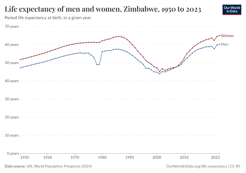 In the chart, you can see life expectancy at birth for men and women in Zimbabwe.