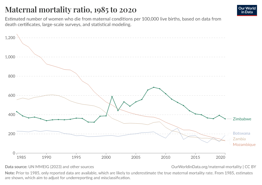 In the chart, you can see Zimbabwe’s maternal mortality rates over time, alongside neighboring countries for comparison. This is measured as the number of deaths per 100,000 live births.