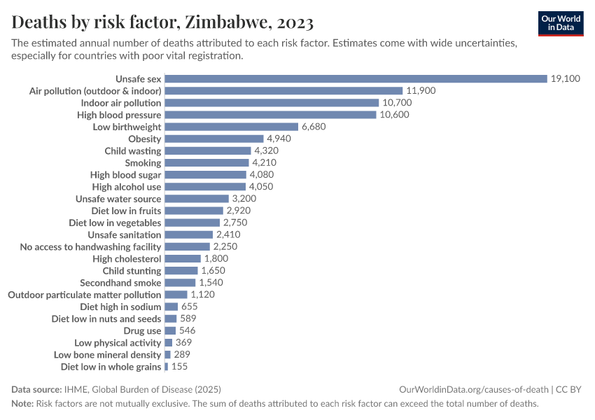 In the chart, you can see modeled estimates for how many people in Zimbabwe die prematurely as a result of various risk factors. Note that the same death can be attributed to multiple risk factors, so the death tolls from different risk factors cannot simply be added up (this is why their sum can be higher than the total number of deaths).