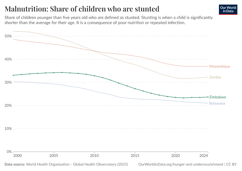 In the chart, you can see what share of children in Zimbabwe are stunted, alongside neighboring countries. In 2024, this share was 23.7%.