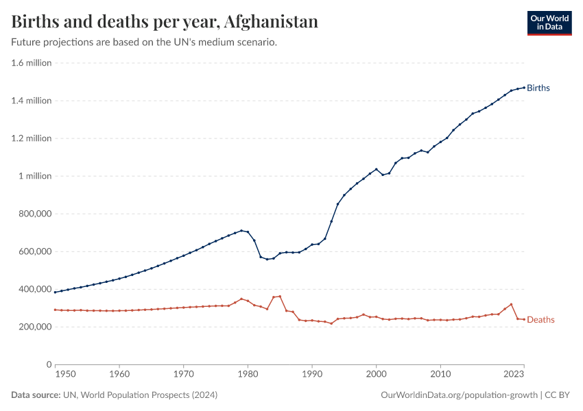 The chart below shows how births and deaths in Afghanistan have changed over time.