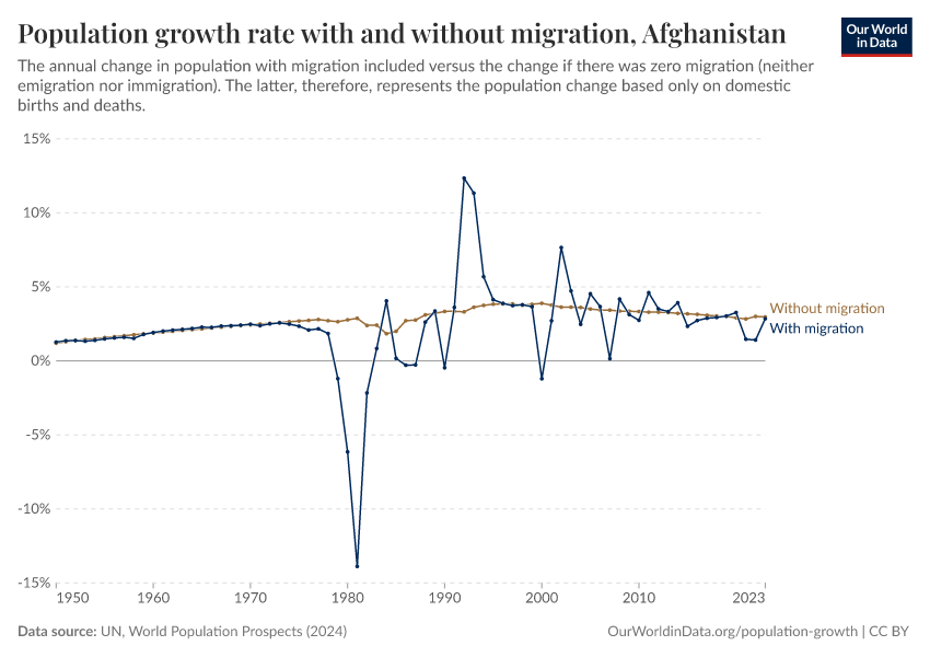 In the chart, you can see Afghanistan’s population change with migration, next to a scenario where migration was zero. In this case, population changes would only be determined by births and deaths.