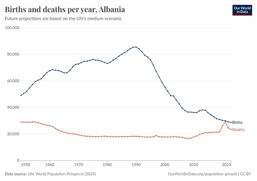 The chart below shows how births and deaths in Albania have changed over time.