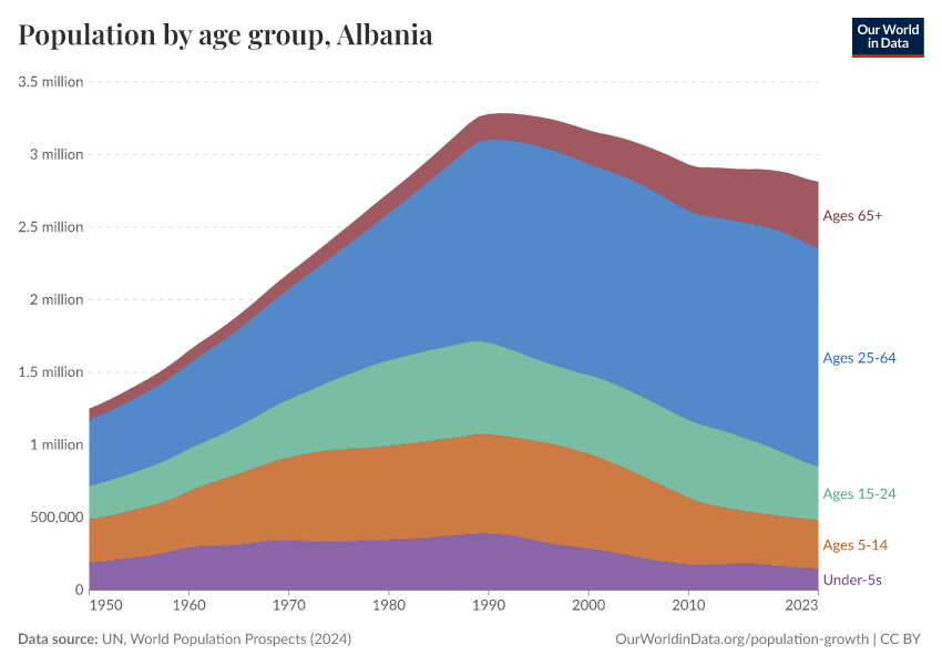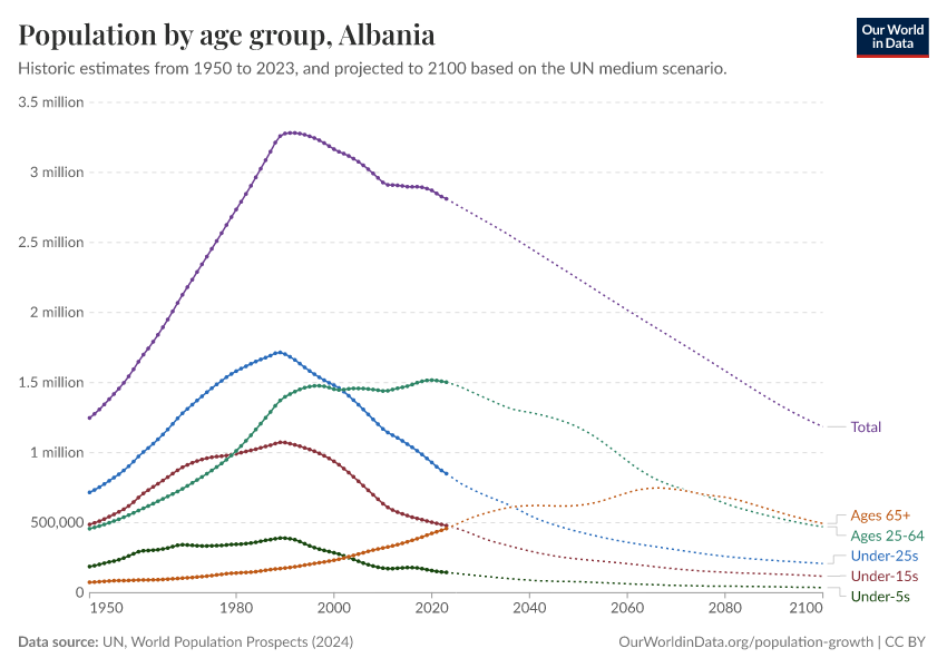 Hannah Ritchie (2026) - “Population and Demography” Published online at OurWorldinData.org. Retrieved from: 'https://ourworldindata.org/profile/population-demography/albania' [Online Resource]BibTeX citation