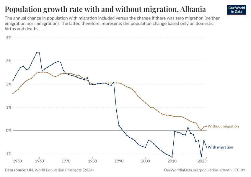 In the chart, you can see Albania’s population change with migration, next to a scenario where migration was zero. In this case, population changes would only be determined by births and deaths.