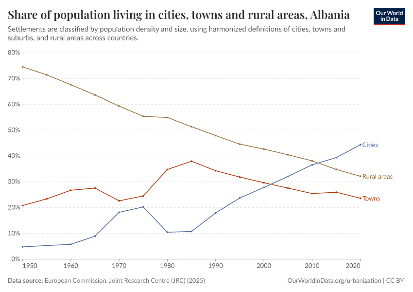 In the chart, you can see how the share of people in Albania who live in rural areas, towns, and cities has changed over time.
