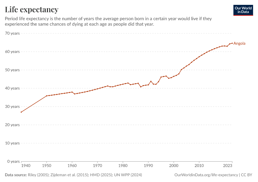 In 2023, Angola’s life expectancy at birth was 64.6 years.