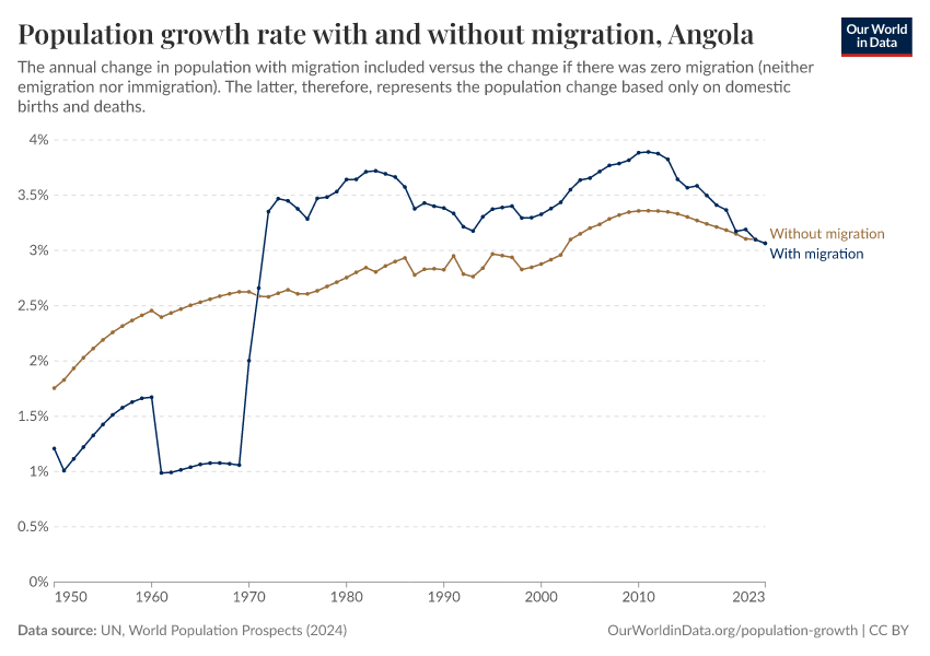 In the chart, you can see Angola’s population change with migration, next to a scenario where migration was zero. In this case, population changes would only be determined by births and deaths.