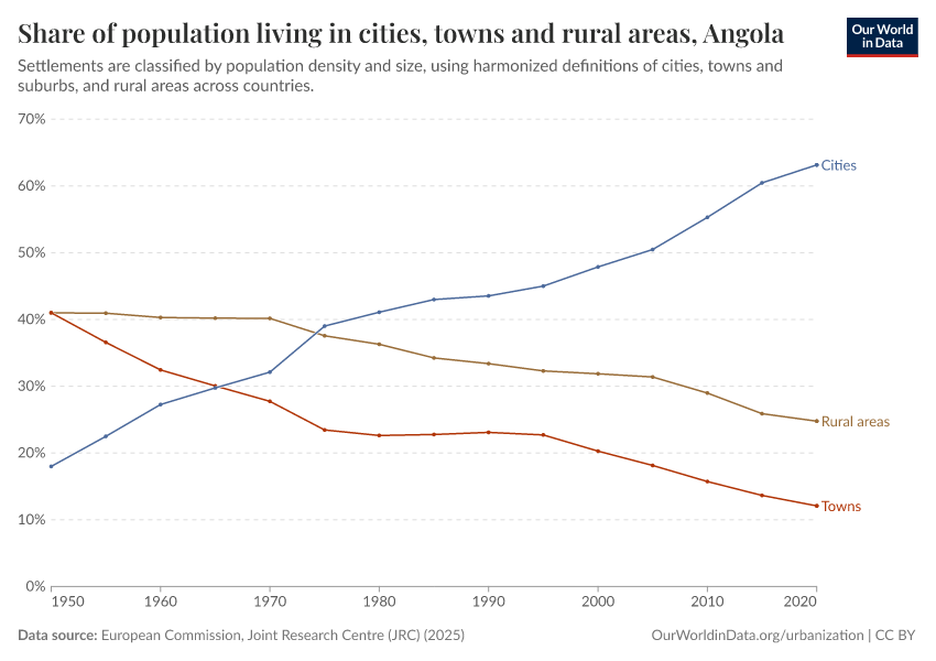 In the chart, you can see how the share of people in Angola who live in rural areas, towns, and cities has changed over time.