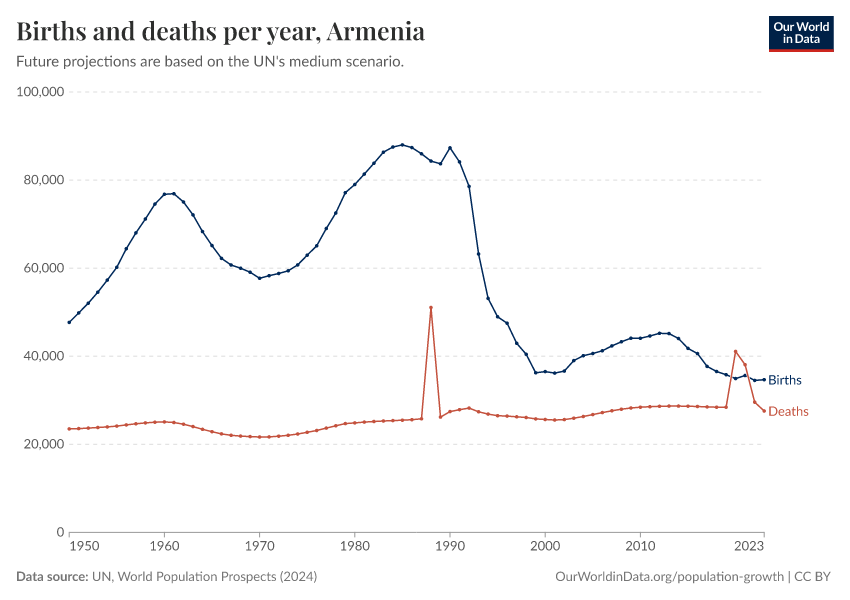 The chart below shows how births and deaths in Armenia have changed over time.