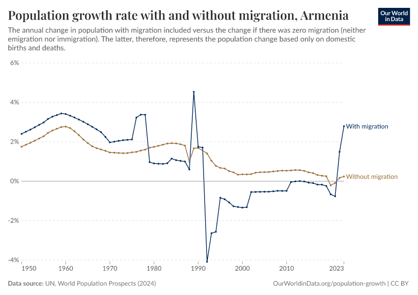 In the chart, you can see Armenia’s population change with migration, next to a scenario where migration was zero. In this case, population changes would only be determined by births and deaths.