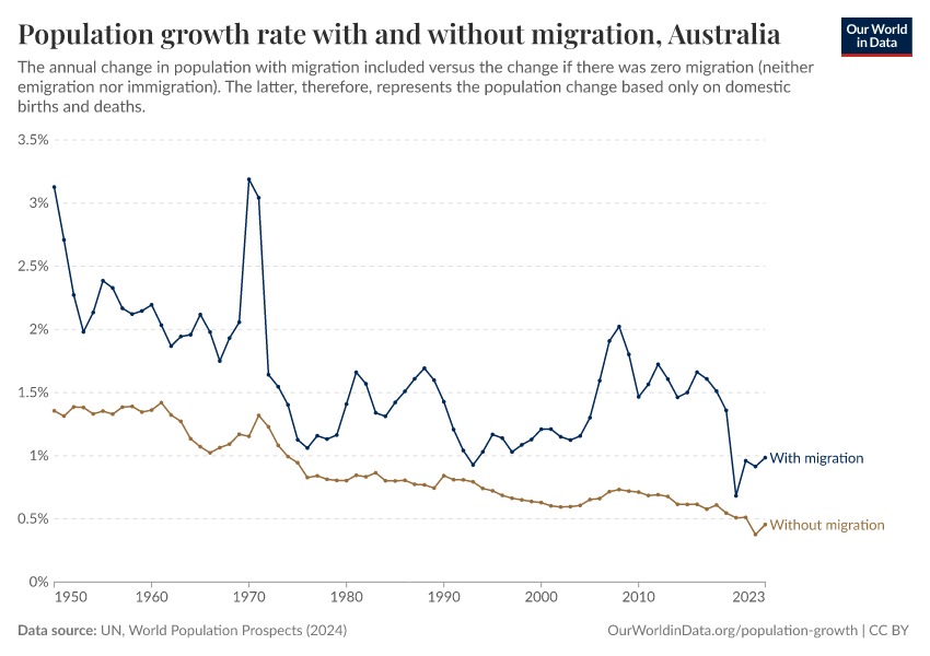 In the chart, you can see Australia’s population change with migration, next to a scenario where migration was zero. In this case, population changes would only be determined by births and deaths.