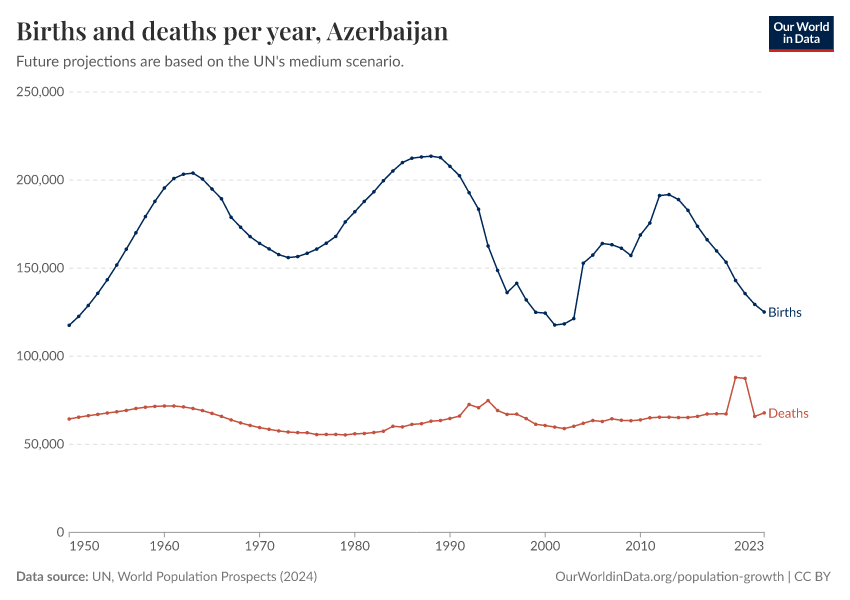 The chart below shows how births and deaths in Azerbaijan have changed over time.