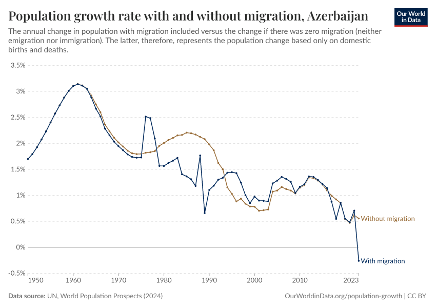 In the chart, you can see Azerbaijan’s population change with migration, next to a scenario where migration was zero. In this case, population changes would only be determined by births and deaths.