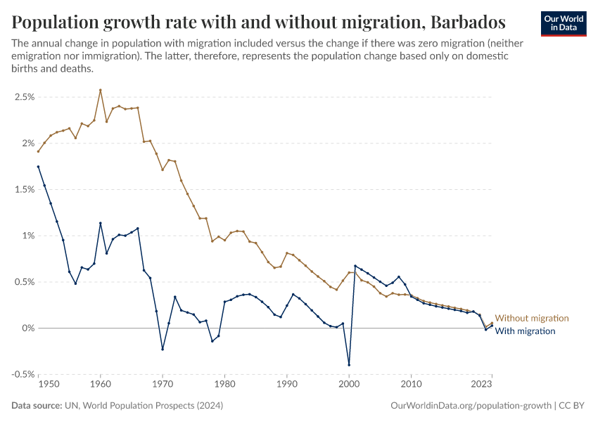In the chart, you can see Barbados’ population change with migration, next to a scenario where migration was zero. In this case, population changes would only be determined by births and deaths.