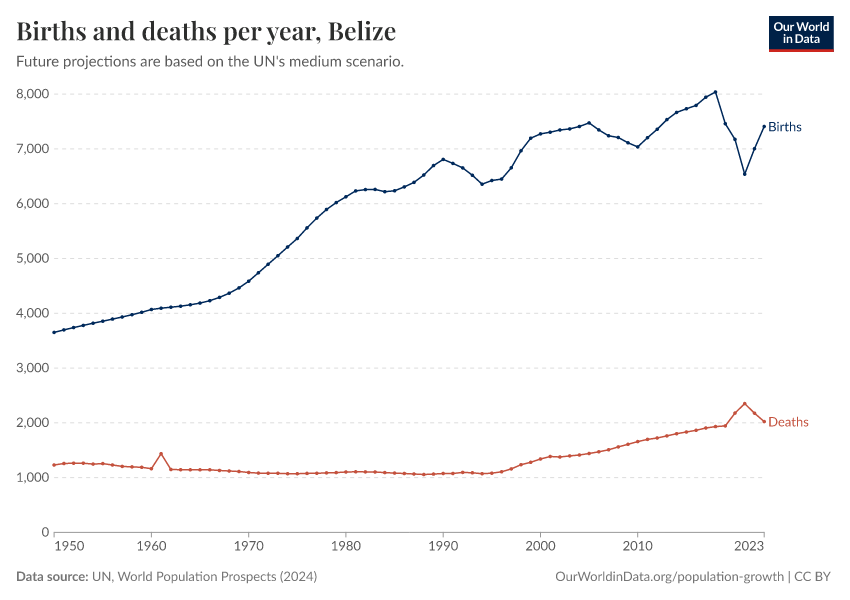 The chart below shows how births and deaths in Belize have changed over time.