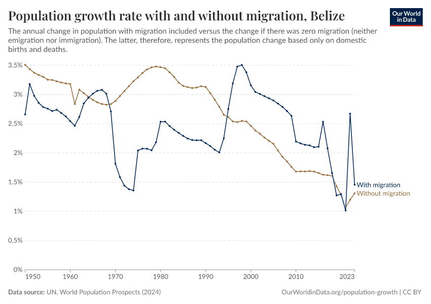 In the chart, you can see Belize’s population change with migration, next to a scenario where migration was zero. In this case, population changes would only be determined by births and deaths.