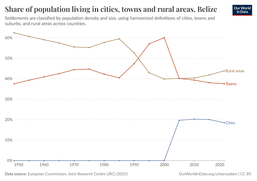 In the chart, you can see how the share of people in Belize who live in rural areas, towns, and cities has changed over time.