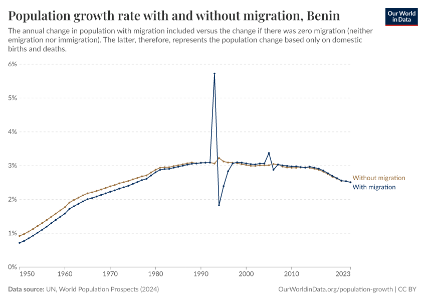 In the chart, you can see Benin’s population change with migration, next to a scenario where migration was zero. In this case, population changes would only be determined by births and deaths.