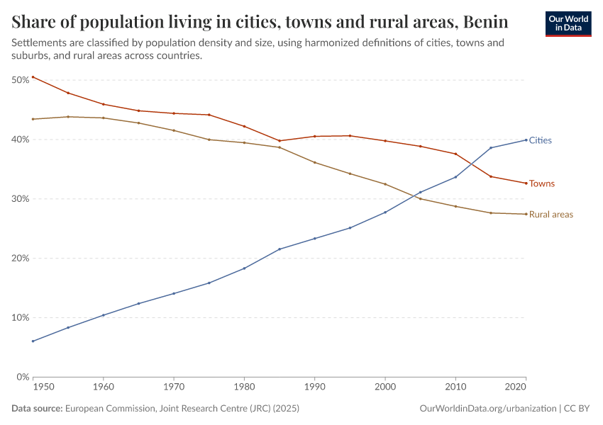 In the chart, you can see how the share of people in Benin who live in rural areas, towns, and cities has changed over time.