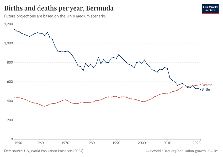 The chart below shows how births and deaths in Bermuda have changed over time.