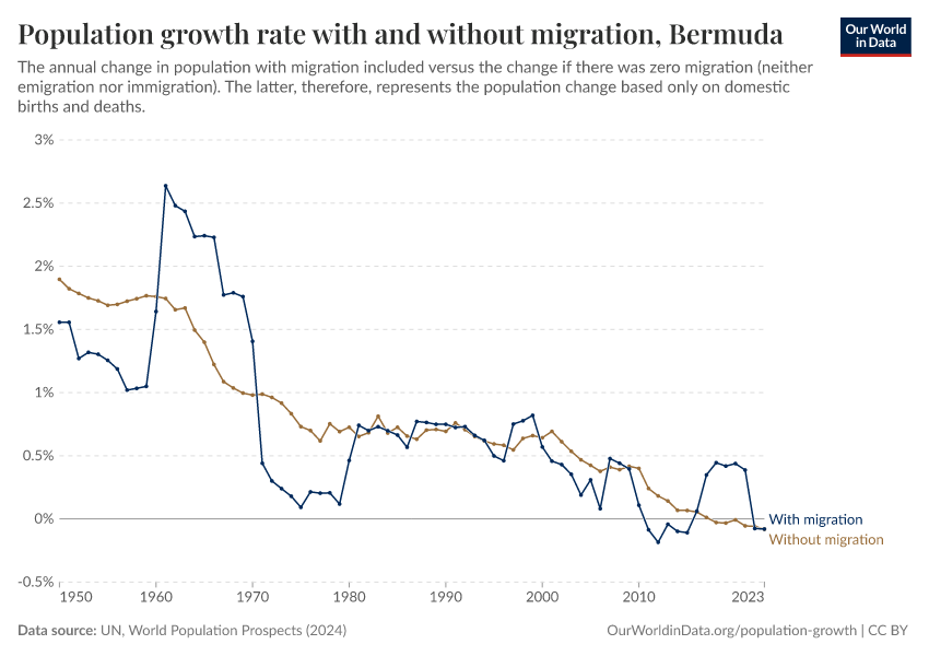 In the chart, you can see Bermuda’s population change with migration, next to a scenario where migration was zero. In this case, population changes would only be determined by births and deaths.