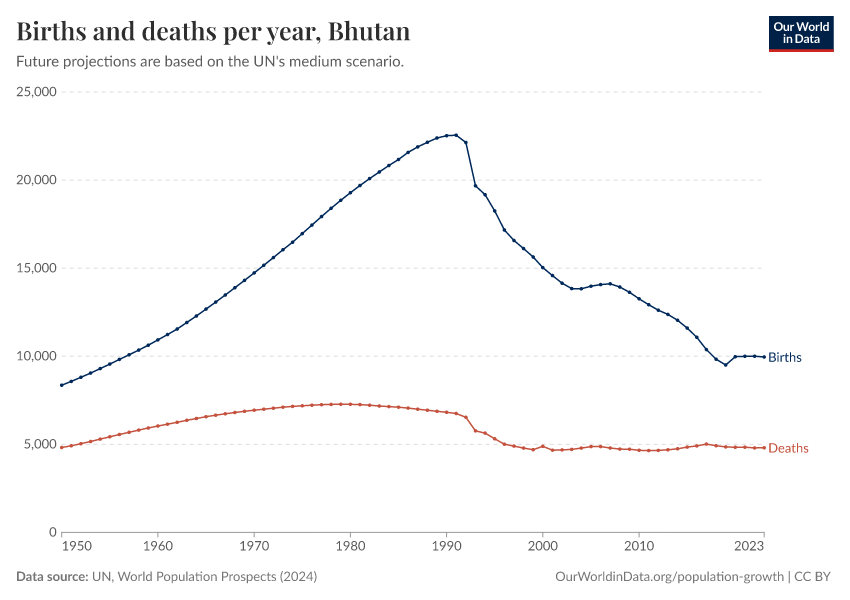 The chart below shows how births and deaths in Bhutan have changed over time.