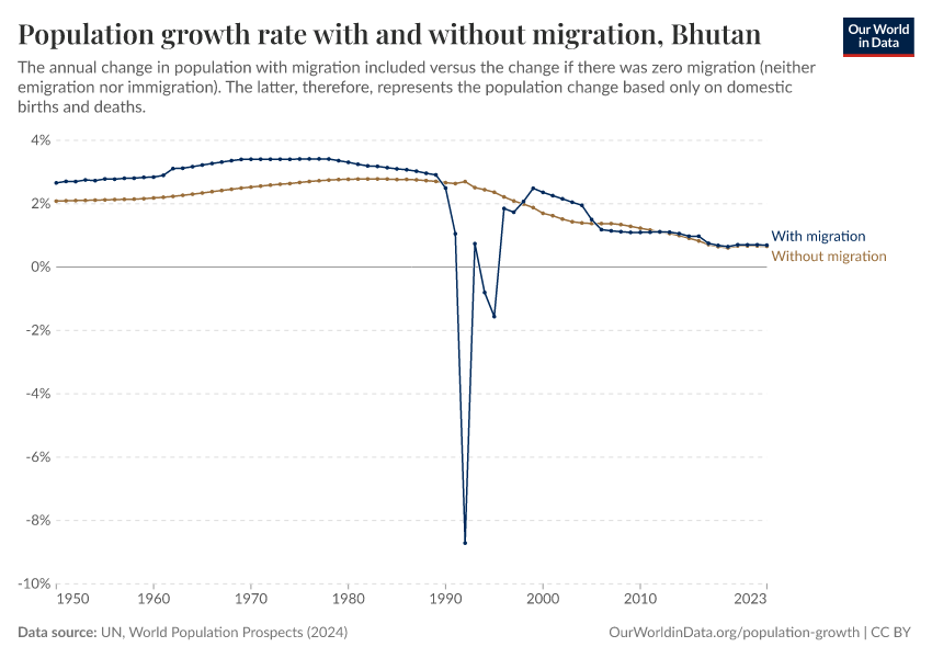 In the chart, you can see Bhutan’s population change with migration, next to a scenario where migration was zero. In this case, population changes would only be determined by births and deaths.