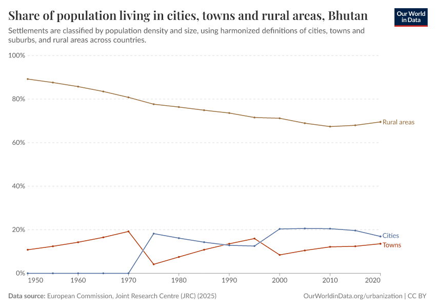 In the chart, you can see how the share of people in Bhutan who live in rural areas, towns, and cities has changed over time.
