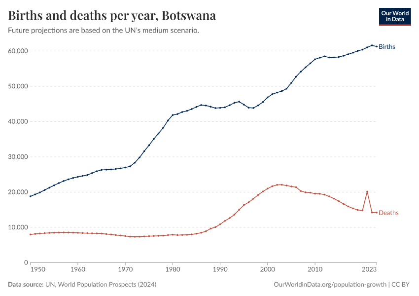 The chart below shows how births and deaths in Botswana have changed over time.