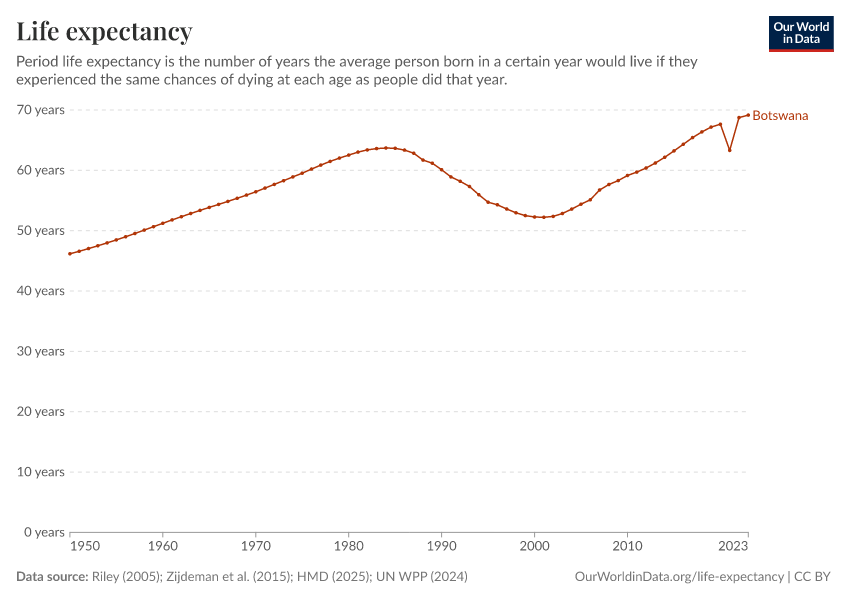In 2023, Botswana’s life expectancy at birth was 69.2 years.