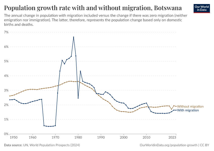 In the chart, you can see Botswana’s population change with migration, next to a scenario where migration was zero. In this case, population changes would only be determined by births and deaths.