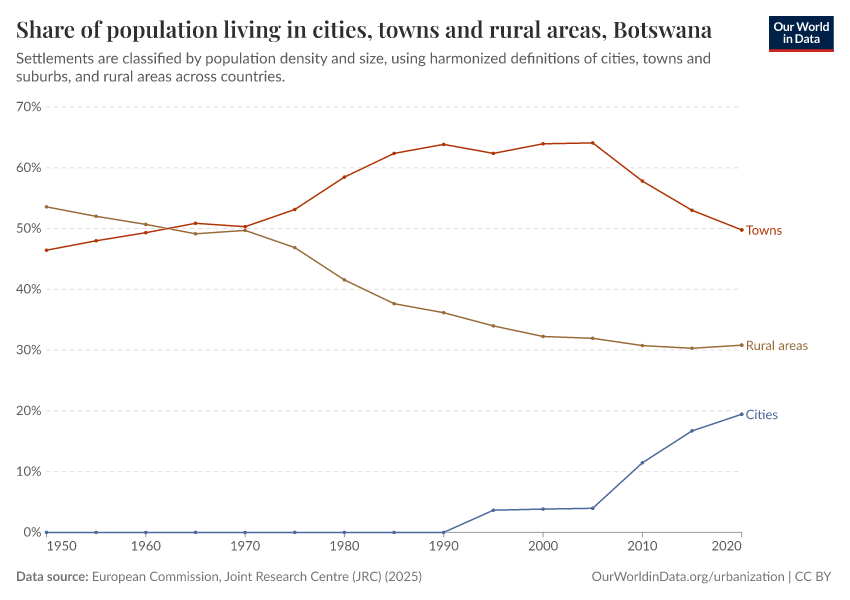 In the chart, you can see how the share of people in Botswana who live in rural areas, towns, and cities has changed over time.
