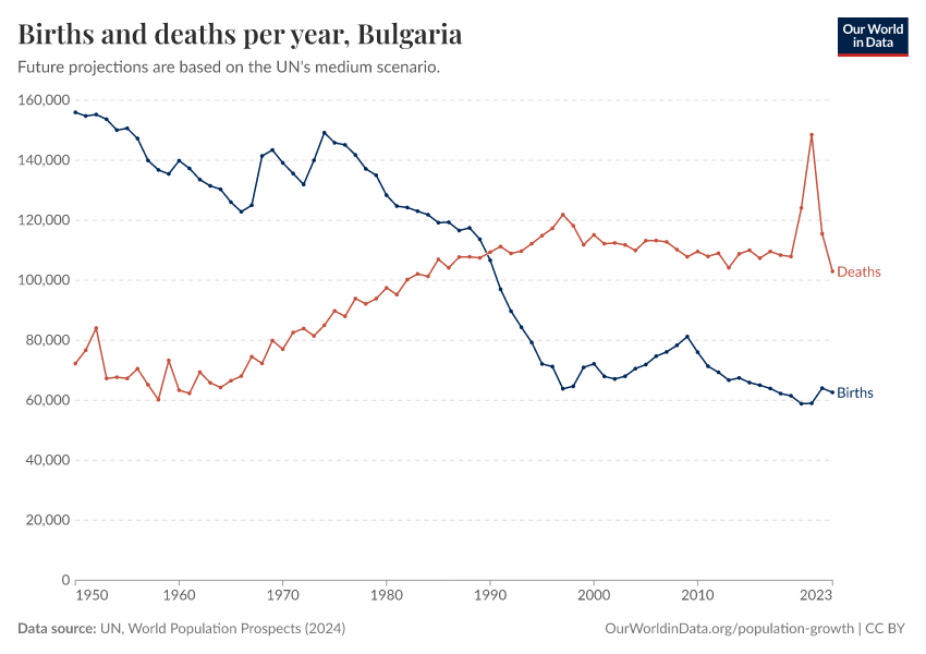 The chart below shows how births and deaths in Bulgaria have changed over time.