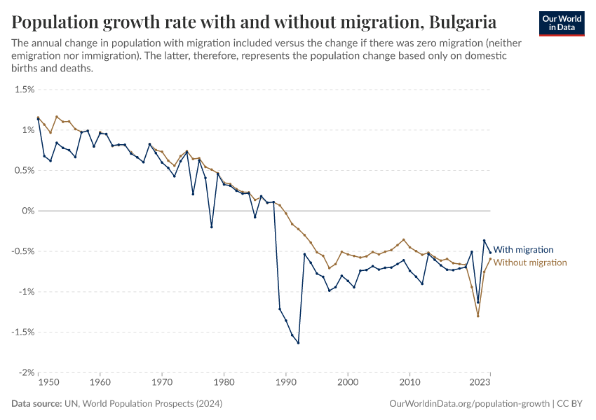 In the chart, you can see Bulgaria’s population change with migration, next to a scenario where migration was zero. In this case, population changes would only be determined by births and deaths.